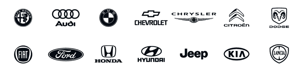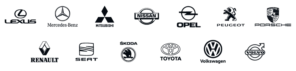 Citroën, Mitsubishi, BMW, Chevrolet, Chrysler, Jeep, Dodge, Fiat, Alfa Romeo, Lancia, Ford, Opel, Honda, Hyundai, KIA, Mercedes Benz, Nissan, Peugeot, Porsche, Renault, SEAT, Lexus, Toyota, Audi, Skoda, Volkswagen, SAAB y Volvo.